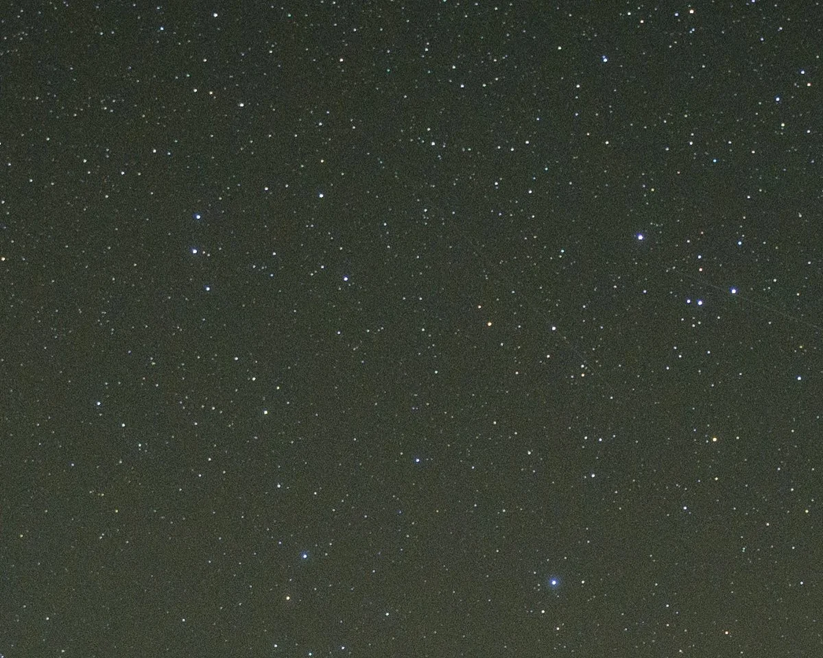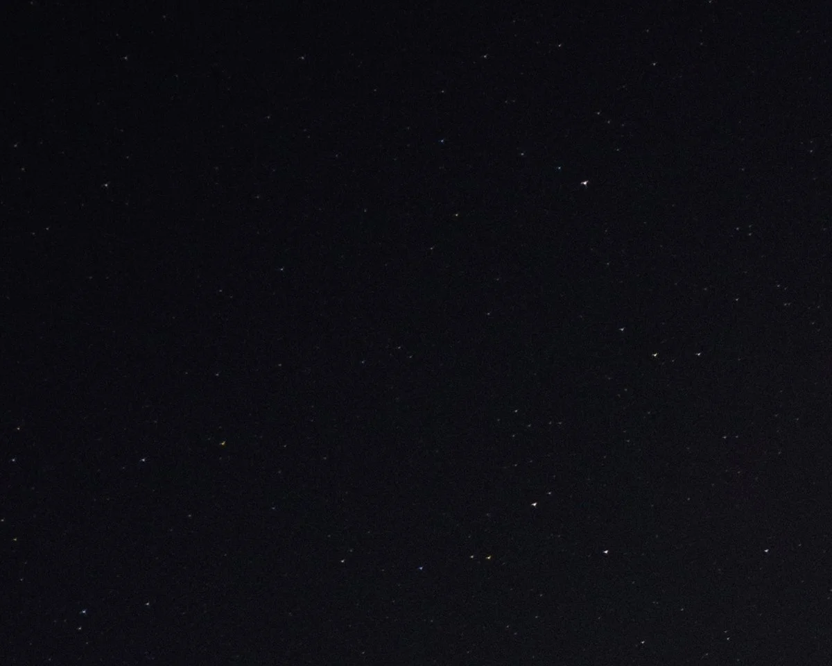 This is a 100% crop from the deepest corner on a 45MP Z8 body at it’s widest focal length of 14mm of the headline shot in this article. This is very good performance from a fast, rectilinear ultra wide lens. Star colour is good, chromatic aberration is under very good control, and star shapes remain very good into the far corners, with almost imperceptable enlargement of their size which is not noticeable in the end shot, even for the discerning viewer, on a large screen or print. Note that some of the glow is due to atmospheric conditions. I also wonder if I was just a slight hair off perfect focus, because in other shots, I’ve seen even better corners (atmospheric conditions too). Another thing to point out here, is that almost every ultra wide angle zoom has some level of field curvature present. This means the plane of focus isn’t perfectly flat. This can reveal itself more at certain points throughout the zoom range. Here, I could have improved this by focusing a bit further out from the centre. Most of the time I advocate focusing 1/3 in from the sides to get balance between central sharpness and corner performance. This doesn’t mean that the centre will turn blurry - no sir, infact it will stay sharp, but the corners will benefit hugely. NB: there was also aurora present during this shot. I’ve shot with a 14mm 1.8 sigma art lens on my DSLRs for years now, and it is crazy how much optics have been able to be improved for astro in the corners. This is in part due to the Z mount no doubt, and of course we are comparing different apertures - however I can tell you even if I put the 14mm 1.8 art to 2.8, the 14-24mm would easily win in this regard. (Of course, I wouldn’t do that, because you shoot a 1.8 lens at 1.8 for these situations and you take the pain of the aberrations). Now let’s move our attention to the centre of the frame and see how the stars look: