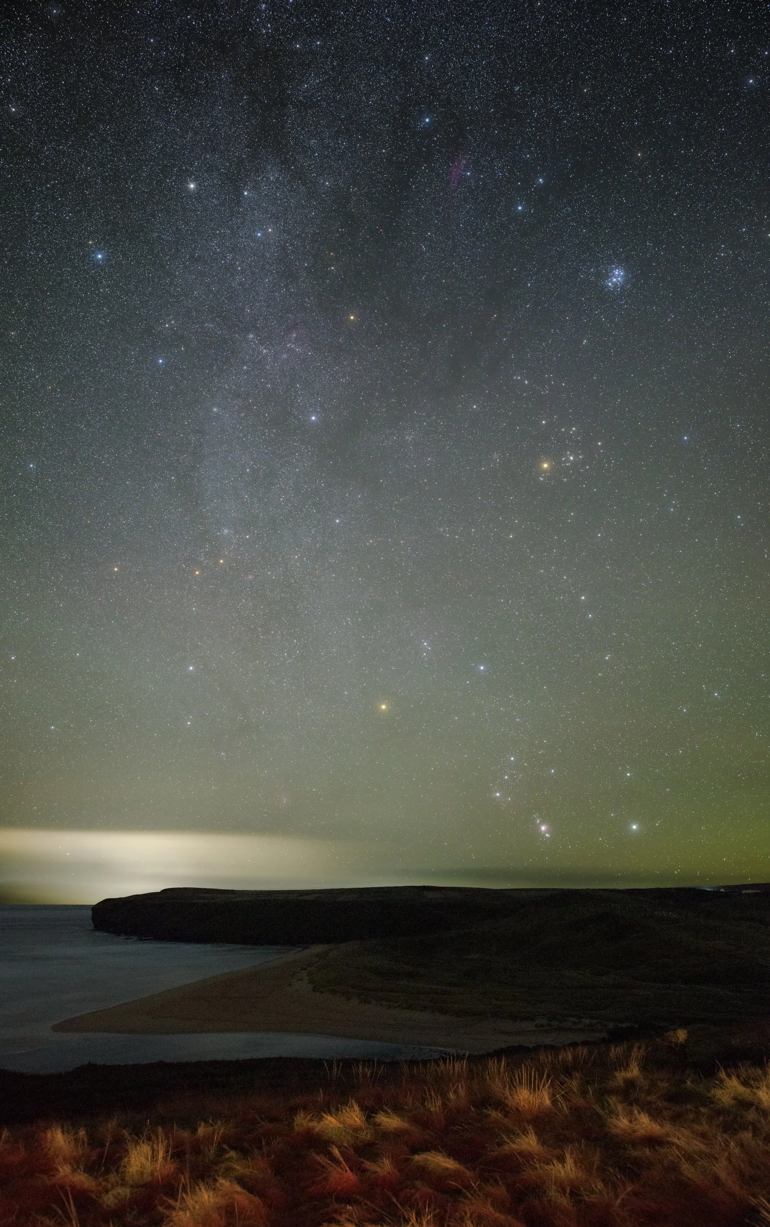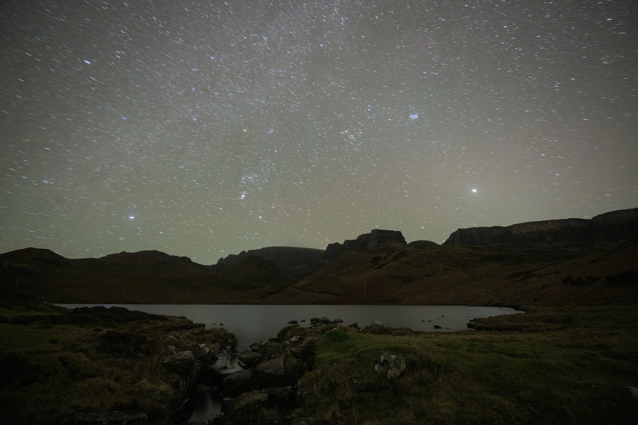The Winter Constellations over the Isle of Skye Scotland. 10 stacked sky pictures, with one ultra long foreground exposure. NB Airglow causing a green colour in this image.